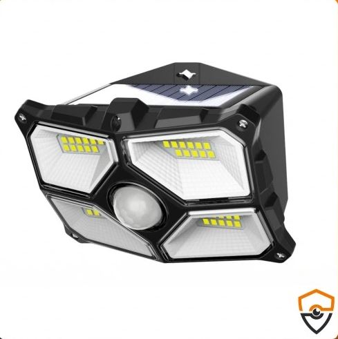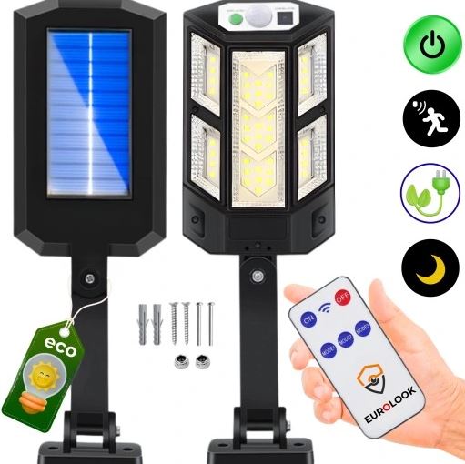 EUROLOOK WL-04 SOLAR to mocny zewnętrzny halogen LED, zasilany panelem solarnym i wyposażony w czujnik zmierzchu i czujnikiem ruchu.